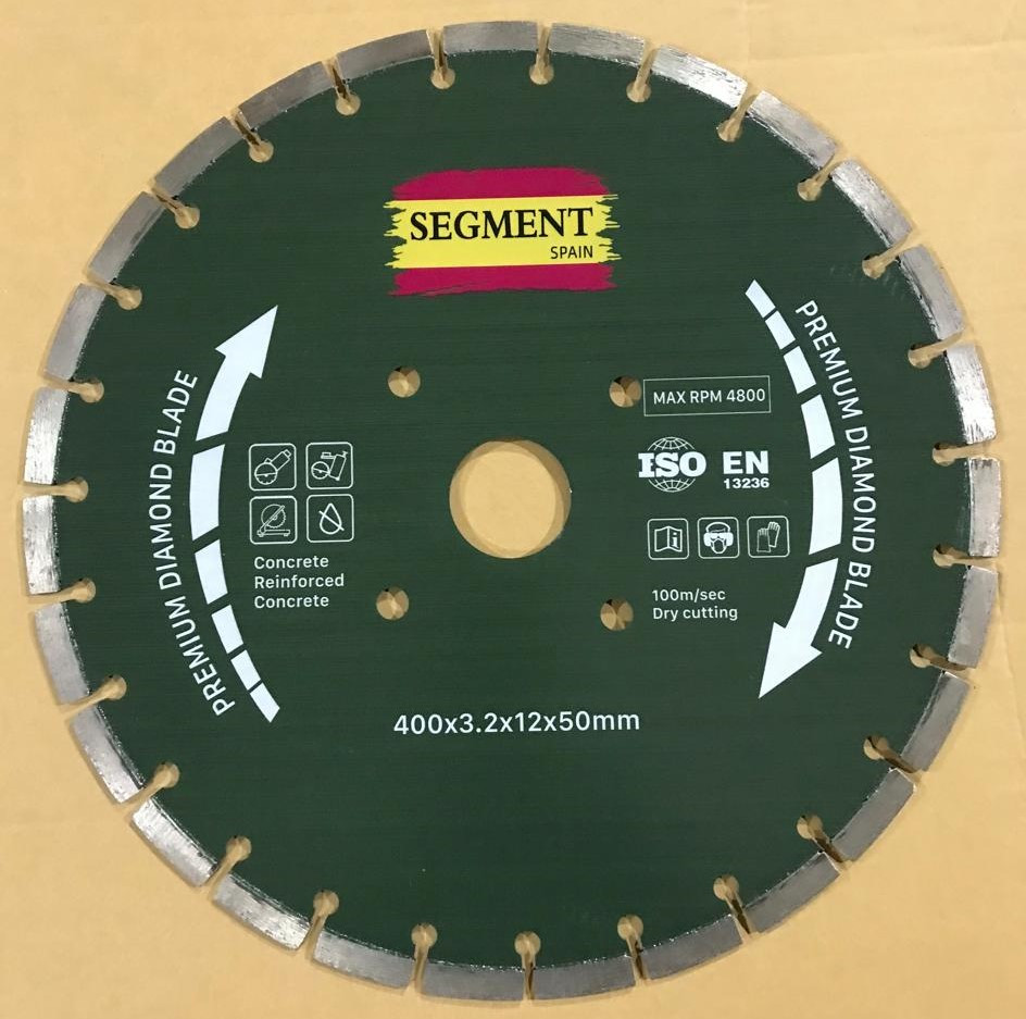 Подходит для работы как с водяным охлаждением, так и без него, а также для больших объемов работ и мощного оборудования. Разделение режущей поверхности на сегменты дает возможность отводить отработанный материал и способствует дополнительному охлаждению. Обладает повышенной производительностью. Имеет высоту алмазного сегмента 12 мм.